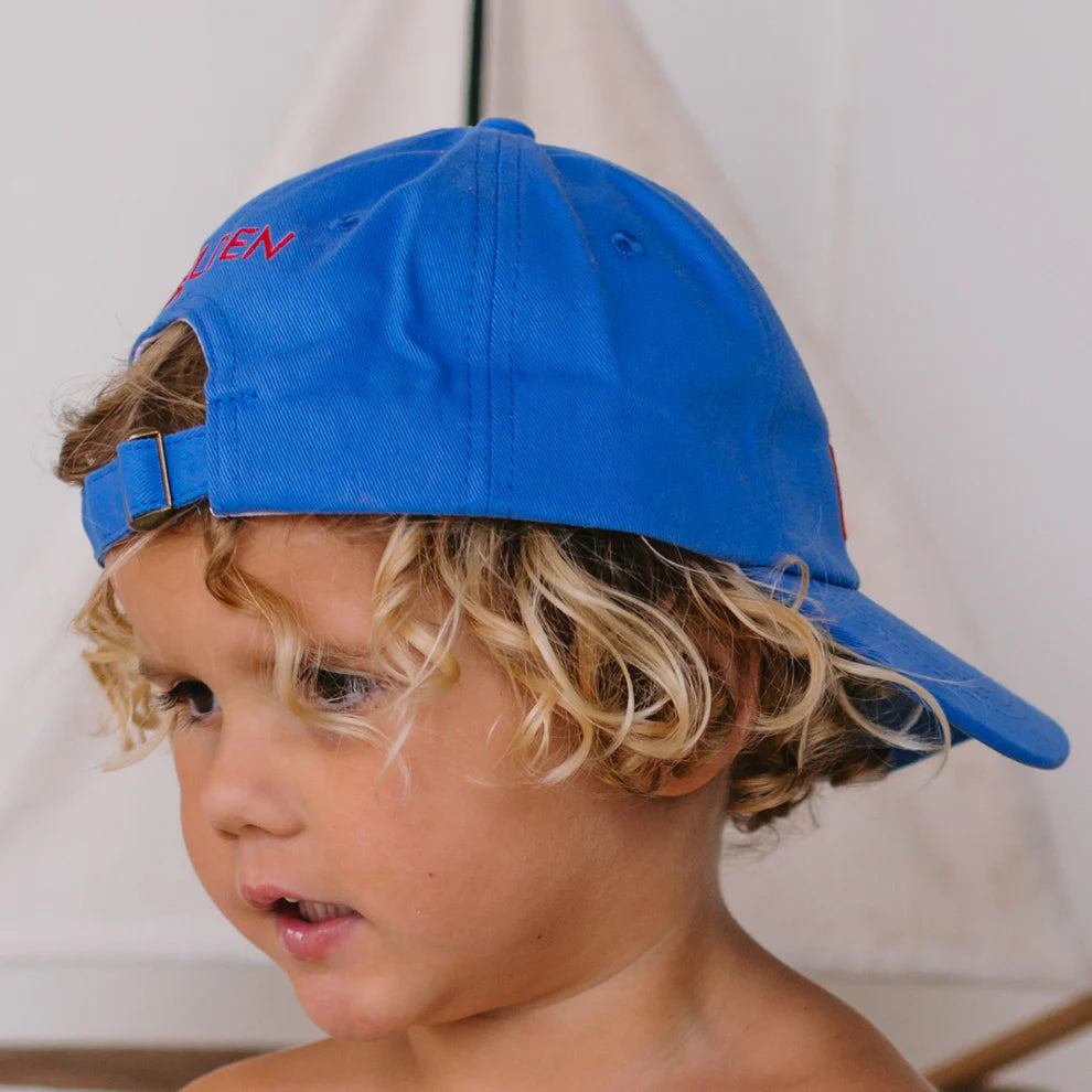 The cap features the words 'Ciao Bella’ and a fish embroidered to the front with the Golden logo embroidered to the back. It is adjustable with a brass clasp to the back. This cap is made from a soft washed 100% cotton twill.