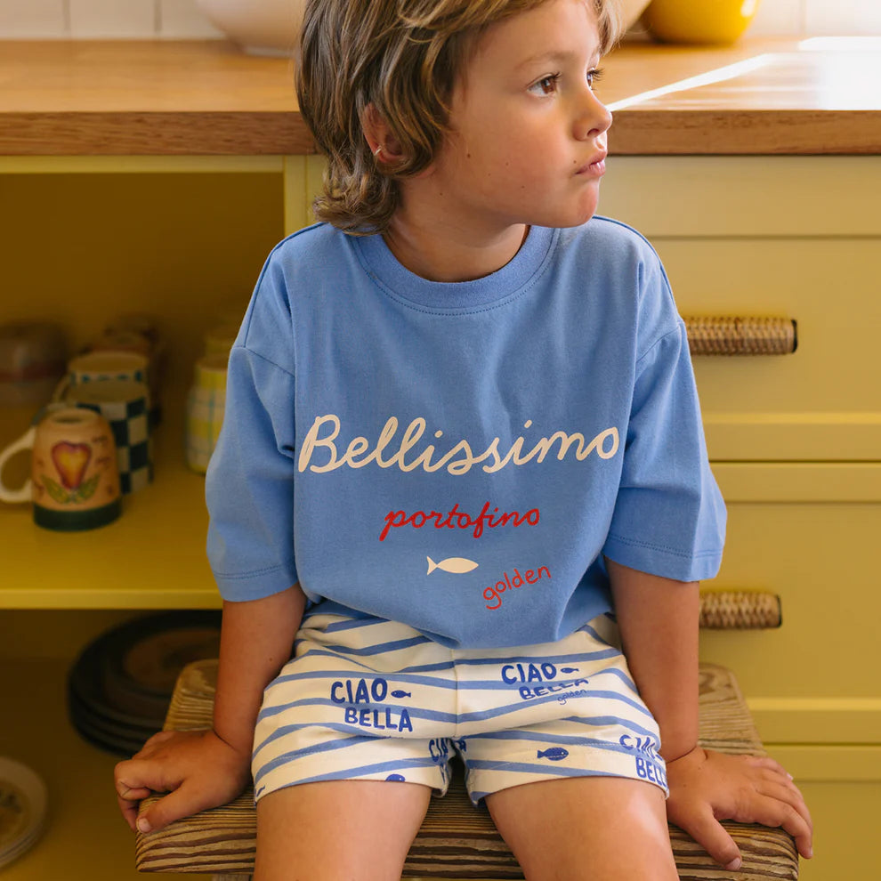 The Bellissimo Tee is made from 95% cotton jersey, 5% spandex with an incredibly soft hand feel. The print is inspired by our love of meal time and that feeling you get when it's all just 'Bellissimo!'