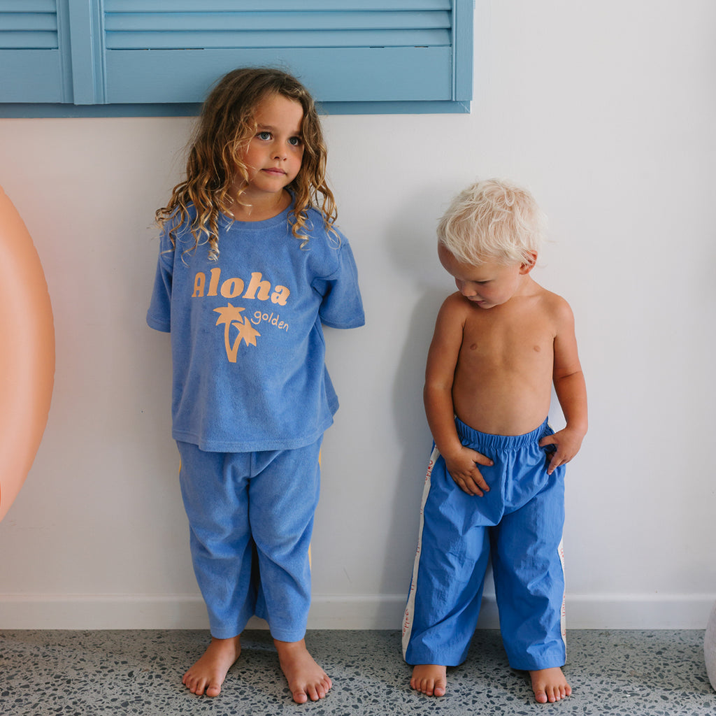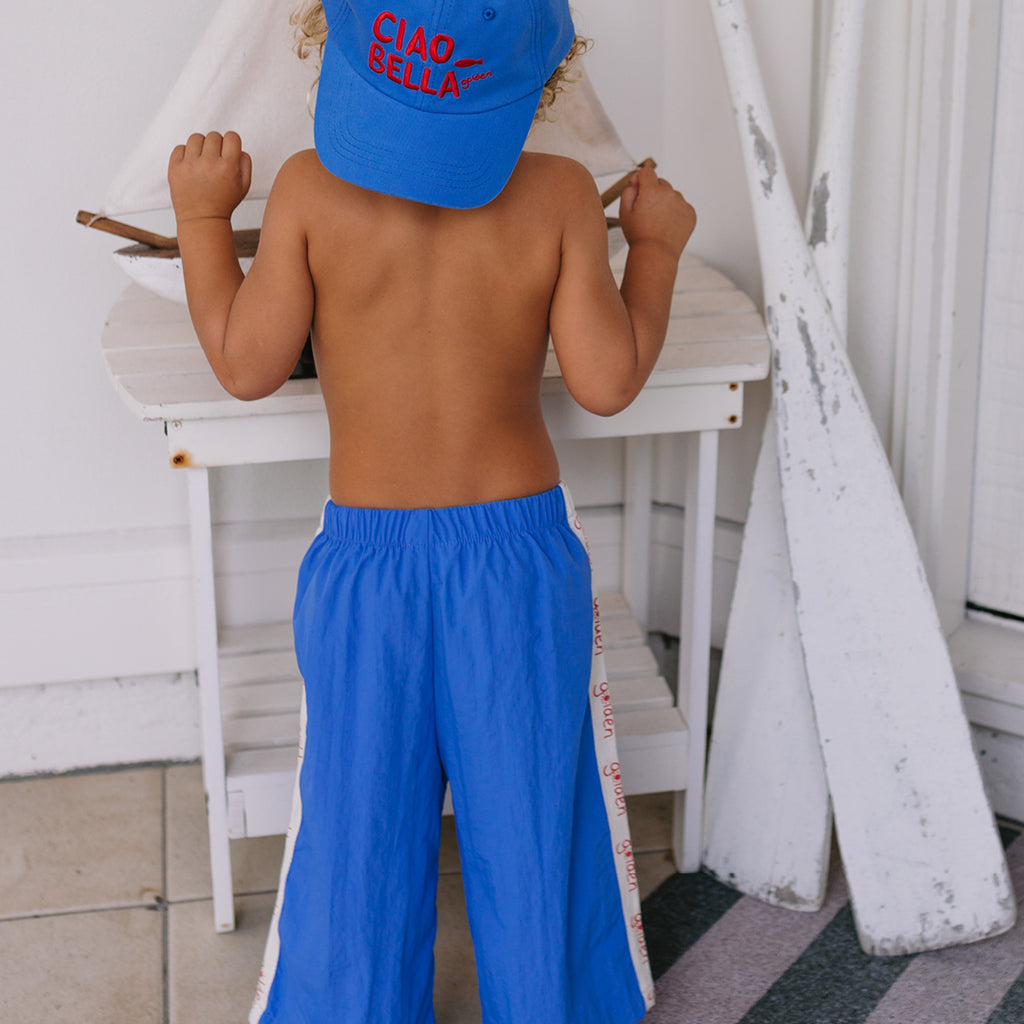 These wide-leg pants are designed for an oversized fit, with an elasticated waist and two concealed side pockets. They feature a contrast golden logo tape on the sides. They are a versatile fit and can be worn slightly cropped as their legs grow. They are super comfortable and adorable on!