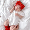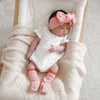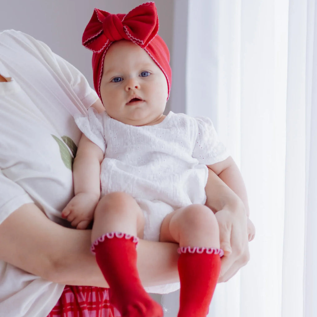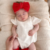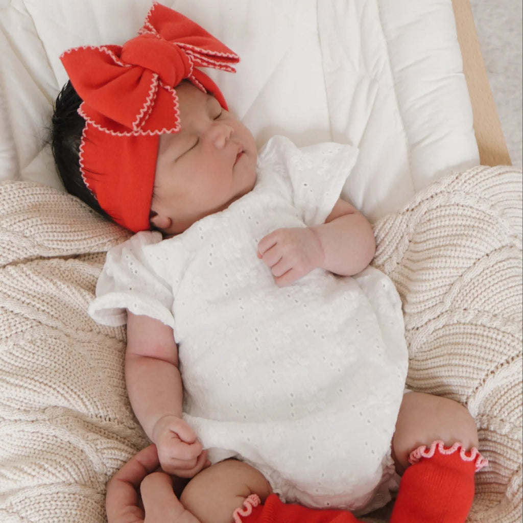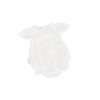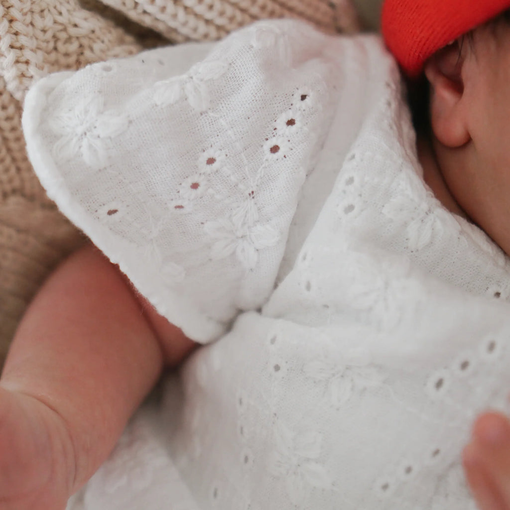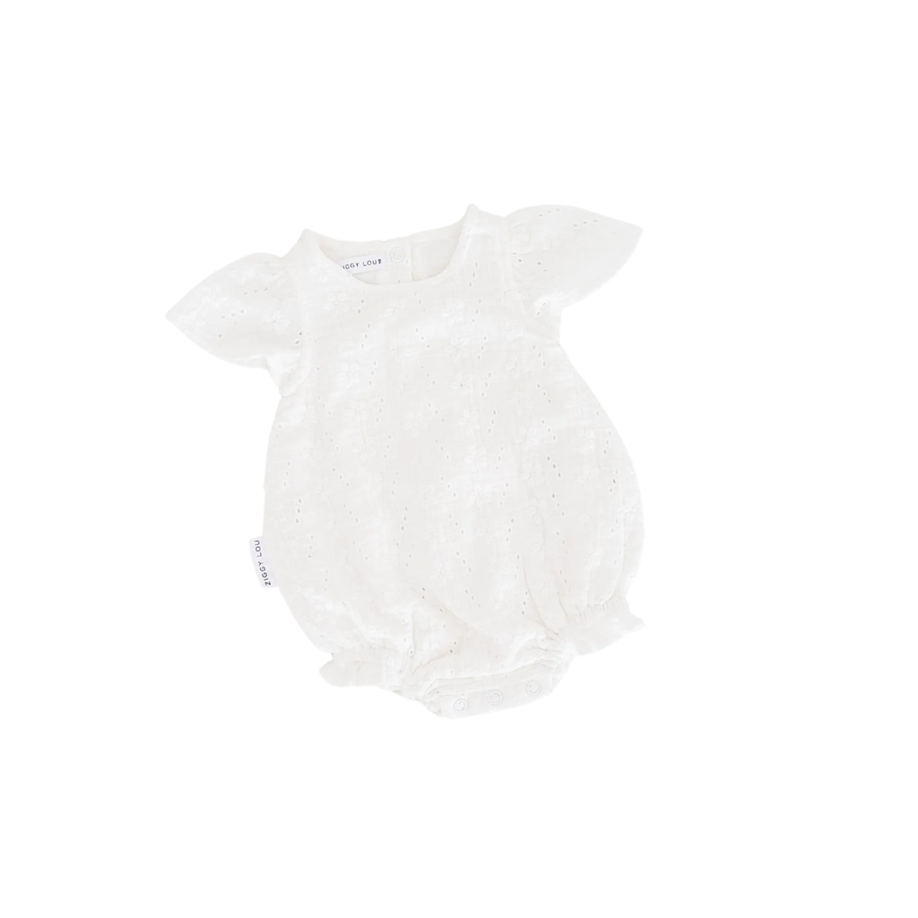 A lined lightweight cotton romper in the Laurel broderie anglaise fabric. Featuring flutter  sleeves and a frill leg, snap buttons at back of the neck and the crotch for easy on/off and nappy changes. Mix and match with items from the Christmas Collection.