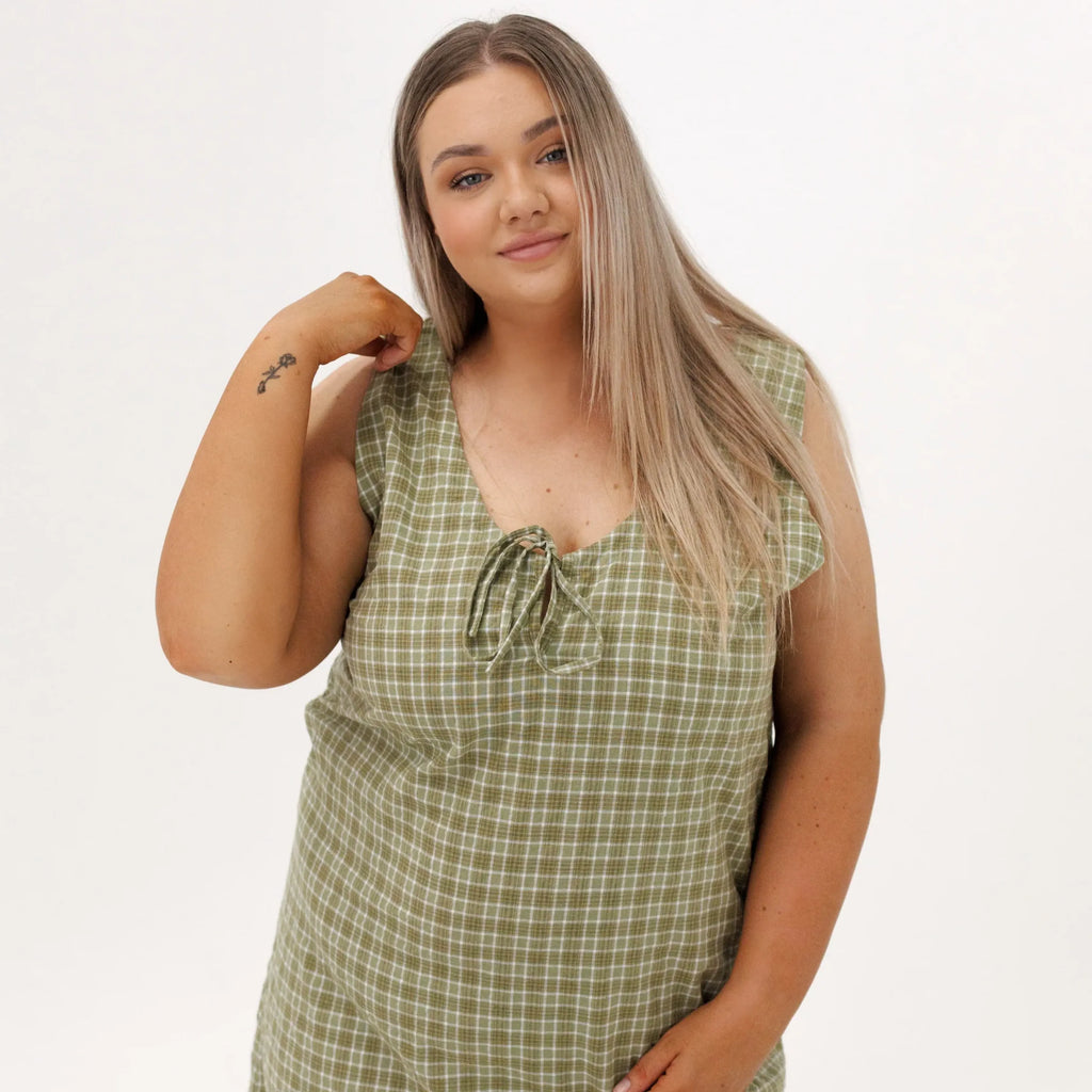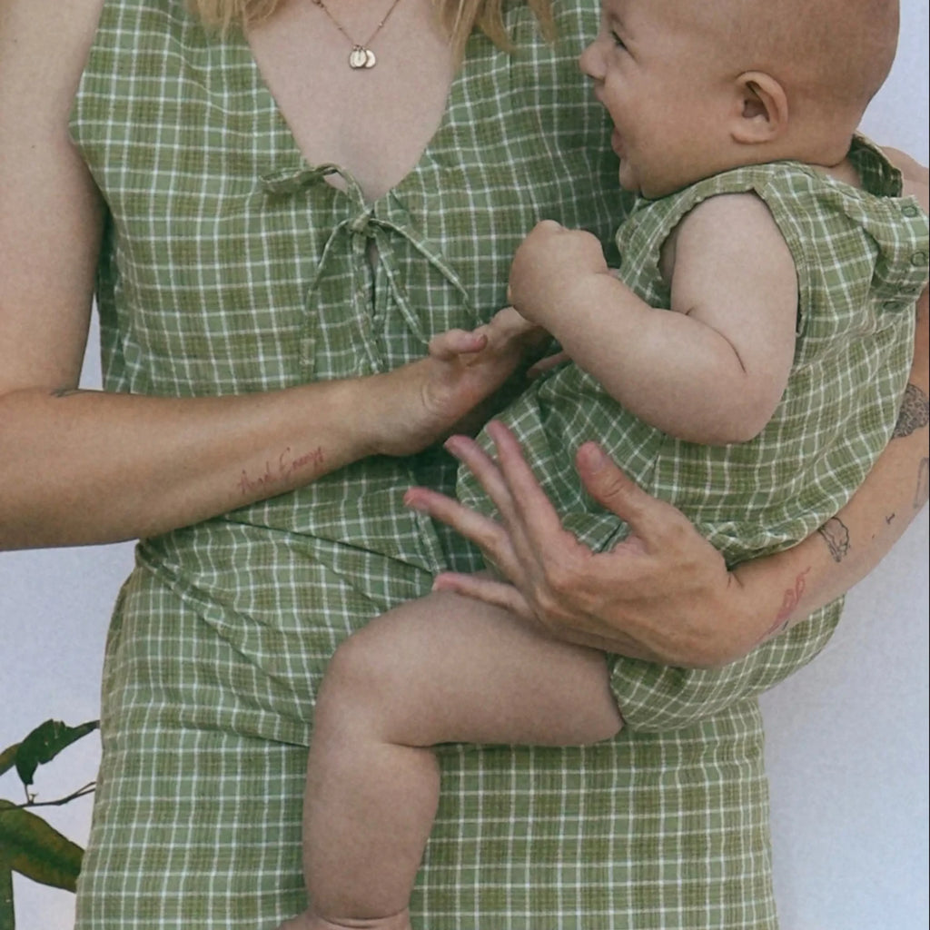 Lightweight cotton dress featuring the Thyme print. Breastfeeding friendly with invisible zips on either side. Adjustable chest tie at front and waist ties at the back allow for a flexible and customisable fit. Option to reverse dress and have tie at back or front.